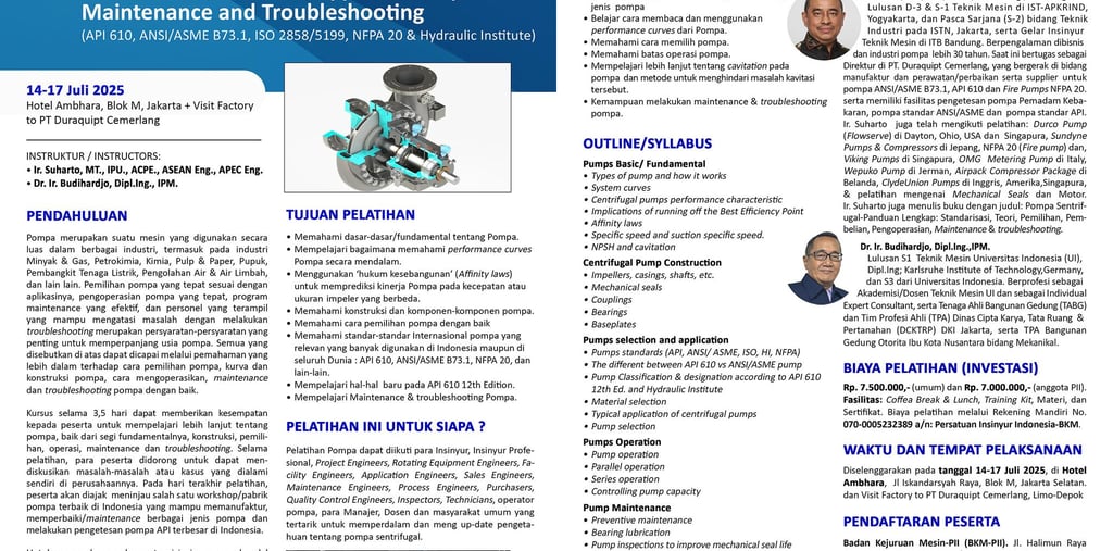 Kursus selama 3,5 hari dapat memberikan kesempatan kepada peserta untuk mempelajari lebih lanjut tentang pompa, baik dari segi fundamentalnya, konstruksi, pemilihan, operasi, maintenance dan troubleshooting. Selama pelatihan, para peserta didorong untuk dapat mendiskusikan masalah-masalah atau kasus yang dialami sendiri di perusahaannya. Pada hari terakhir pelatihan, peserta akan diajak meninjau salah satu workshop/pabrik pompa terbaik di Indonesia yang mampu memanufaktur, memperbaiki/maintenance berbagai jenis pompa dan melakukan pengetesan pompa API terbesar di Indonesia.