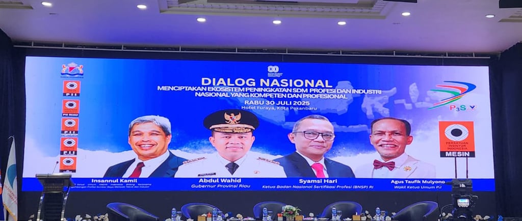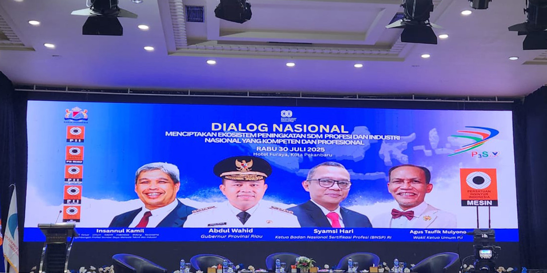 Wakil Ketua Umum KADIN Indonesia Bidang Kerjasama Pengembangan Profesi SDM Teknik dan Industri, dengan Badan Kejuruan Mesin Persatuan Insinyur Indonesia (BKM-PII) , menyelenggarakan Dialog Nasional, dengan tema : “Menciptakan Ekosistem Peningkatan SDM Profesi dan Industri Nasional yang Kompeten dan Profesional”, yang berkolaborasi dengan Persatuan Insinyur Indonesia (PII) Wilayah Provinsi Riau, Wilayah Provinsi DKI Jakarta, Wilayah Provinsi Jawa Tengah dan Wilayah Provinsi Sumatera Barat pada hari Rabu 30 Juli 2025 bertempat di Ballroom Lancang Kuning Hotel Furaya, Kota Pekanbaru yang didukung oleh Pusat Pembinaan Pelatihan & Sertifikasi Mandiri (P3SM).