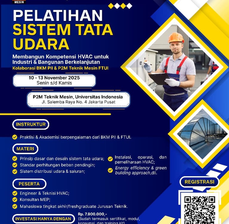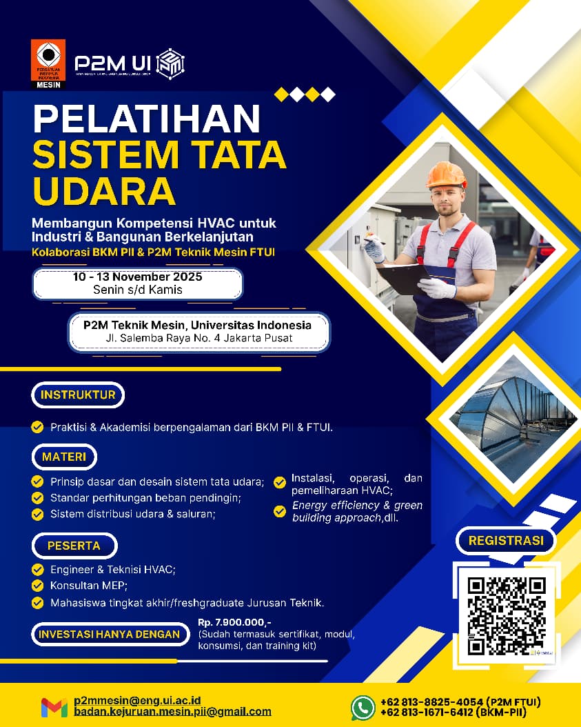 Pelatihan ini dirancang untuk meningkatkan pengetahuan dan kompetensi peserta dalam bidang Perencanaan Sistem Tata Udara. Dengan mengikuti pelatihan ini, peserta yang dinyatakan lulus, memperoleh Sertifikat dari P2M FTUI dan BKM PII.