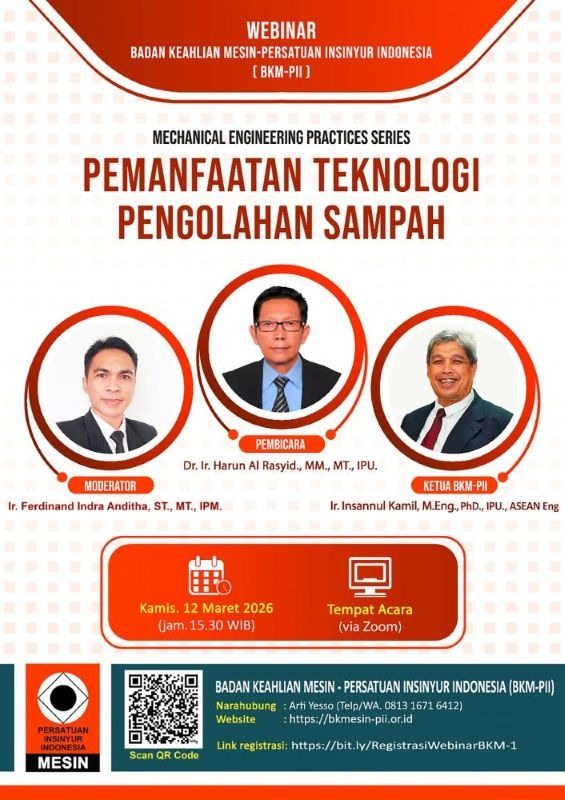 Badan Keahlian Mesin Persatuan Insinyur Indonesia (BKM-PII), pada kesempatan ini akan menyelenggarakan Program WEBINAR, yang bertujuan untuk berbagi pengalaman dan keterampilan profesional para Anggota.