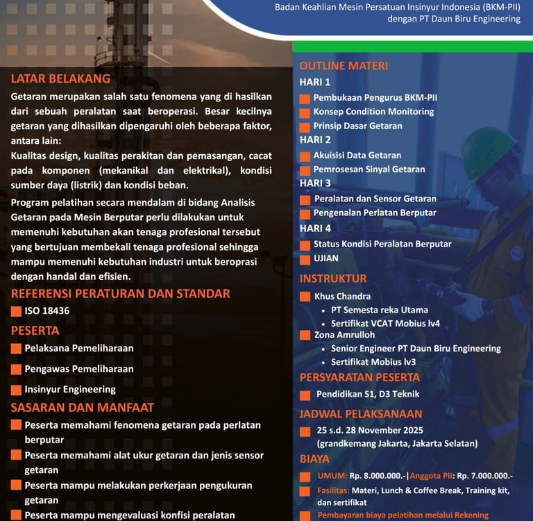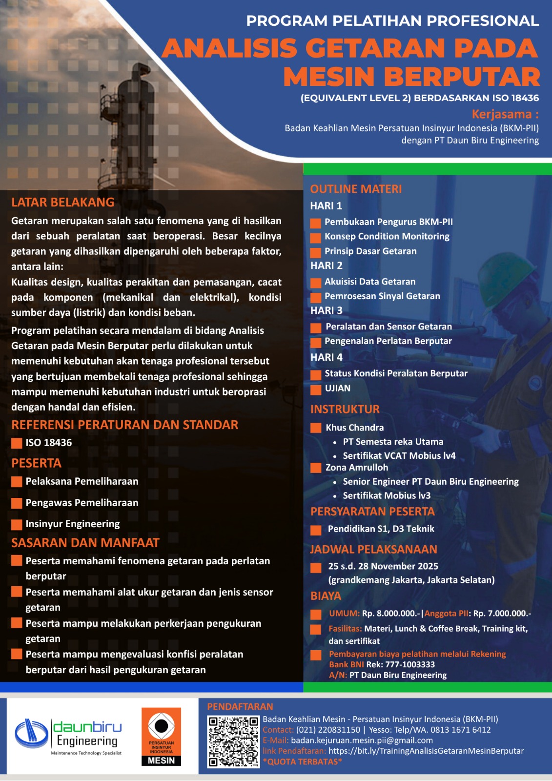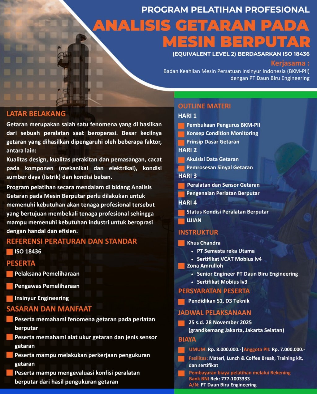 Badan Keahlian Mesin Persatuan Insinyur Indonesia (BKM-PII) bekerja sama dengan PT Daun Biru Engineering kembali membuka program pelatihan profesional Analisis Getaran pada Mesin Berputar. Pelatihan ini dirancang khusus untuk meningkatkan kompetensi para profesional dalam memahami fenomena getaran serta melakukan analisis kondisi peralatan berputar secara efektif dan sesuai standar internasional ISO 18436.